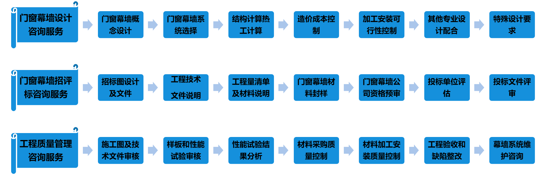 我們提供的門窗幕墻顧問服務(wù)涵蓋了門窗幕墻工程的各個階段,通過對整個工程項目流程的服務(wù)為業(yè)主(建設(shè)方)創(chuàng)造價值、為建筑師提供設(shè)計服務(wù)來完成高品質(zhì)的門窗幕墻。